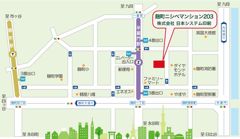 ■地下鉄半蔵門線「半蔵門駅」④出口徒歩1分 ※エレベーター出入り口も近くになります